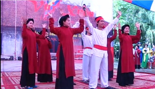 | Tiết mục hát Xoan "Mó Cá" do các thành viên trong phường Xoan An Thái thể hiện |