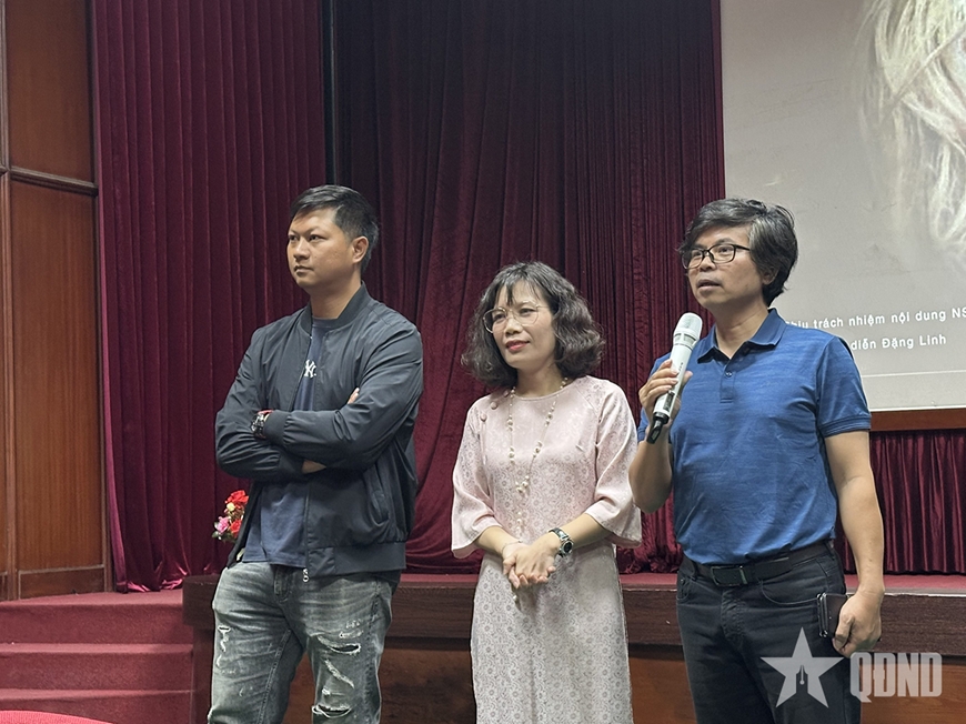 | Quay phim Tạ Đức Nguyên, đạo diễn Đặng Linh, ông Trịnh Quang Tùng - Phó tổng giám đốc Hãng phim Tài liệu và Khoa học Trung ương (theo thứ tự từ trái sang phải) chia sẻ cảm xúc với khán giả sau buổi công chiếu. |