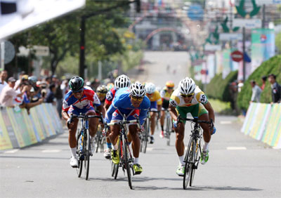 | Nguyễn Thành Tâm (phải) tung nước rút về đích tại chặng 6. (Ảnh: QUANG LIÊM) |