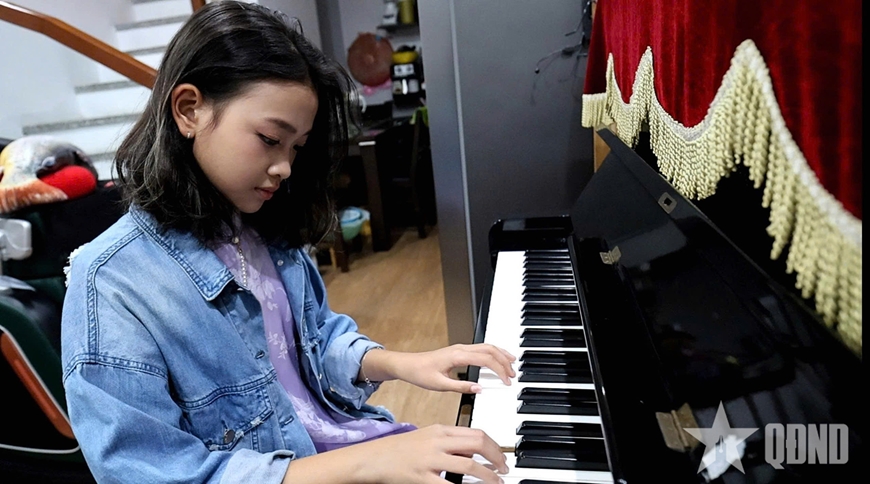 Nguyễn Trúc Anh chăm chỉ tập đàn piano.