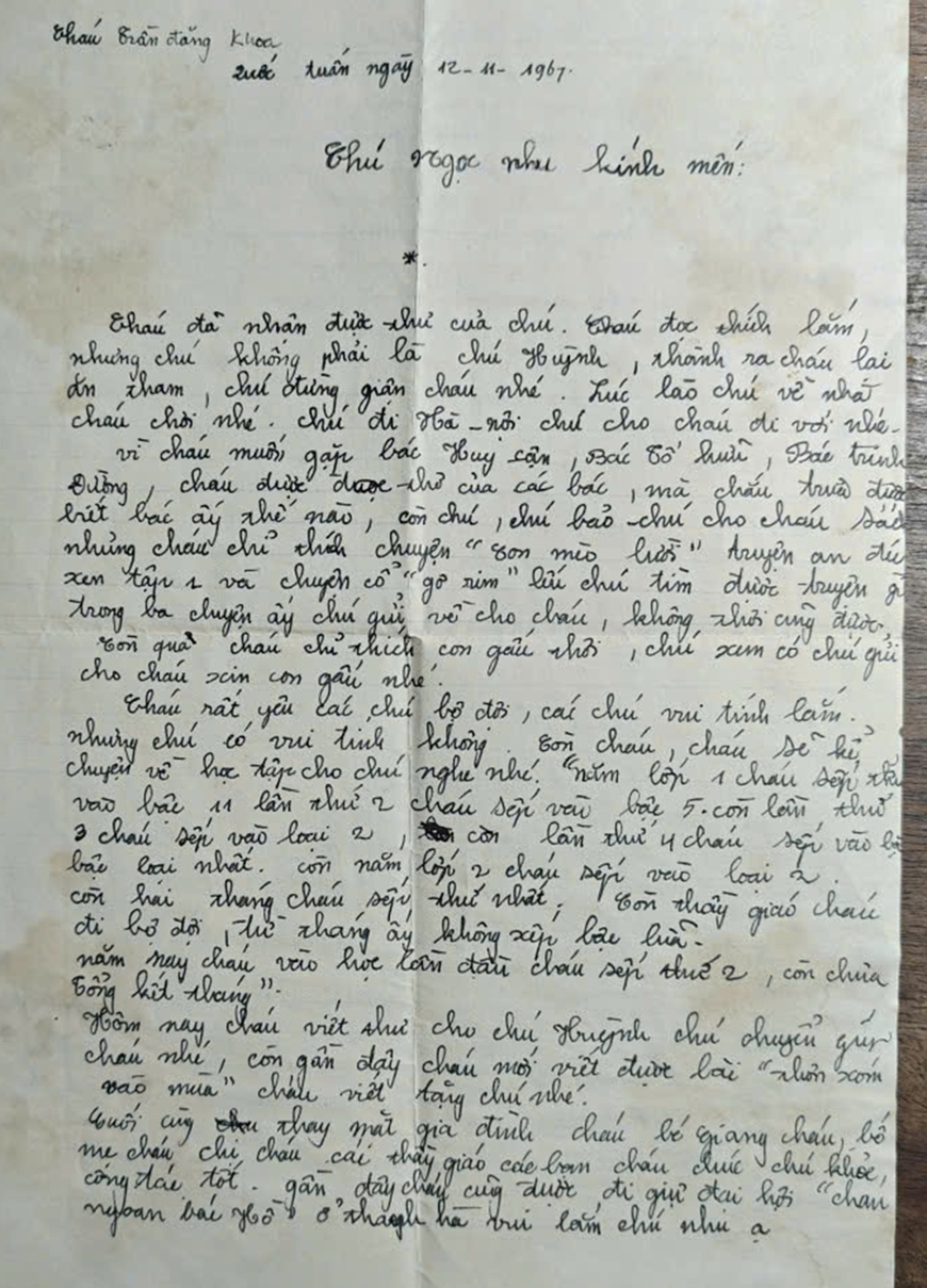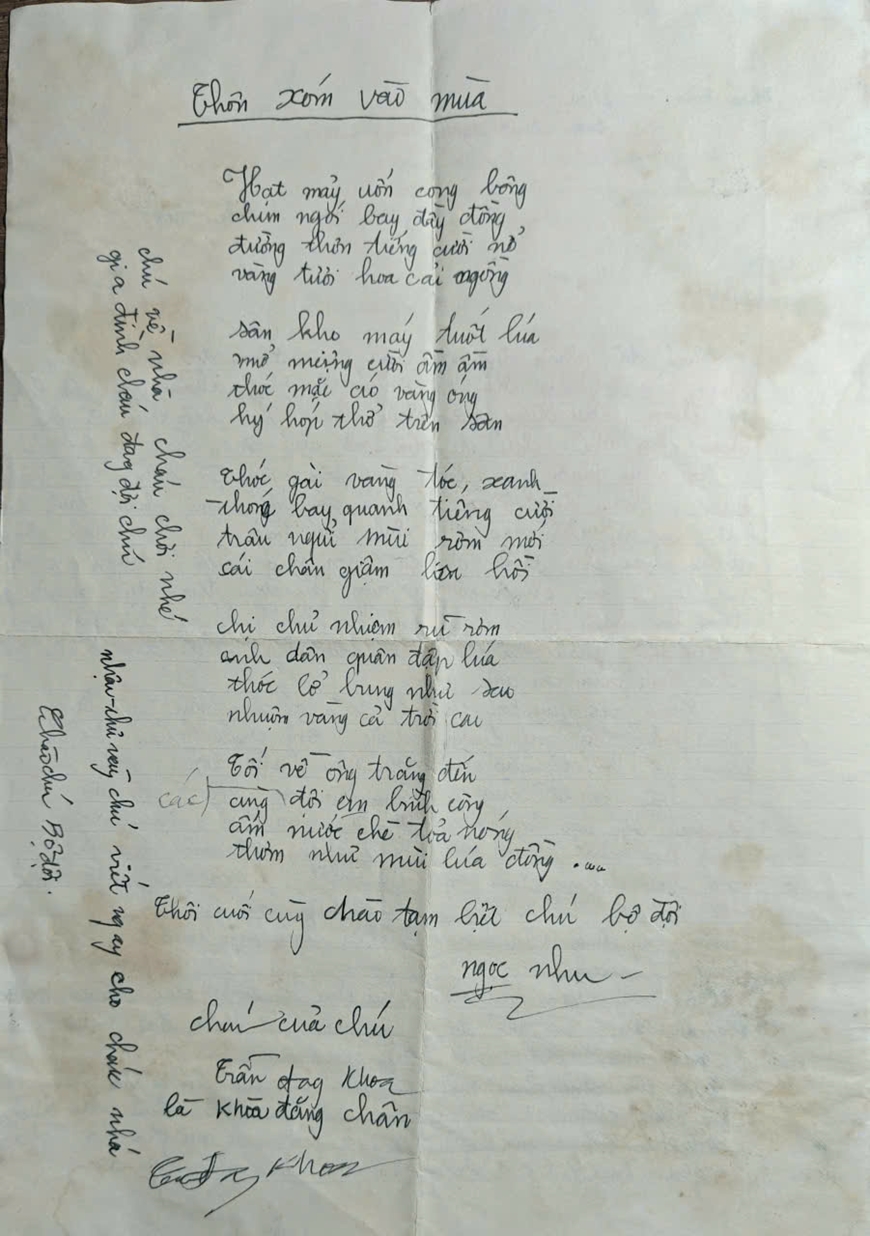 Trao bức thư, chị Thu phân trần: “Cháu mới tìm thấy bức thư này trong chồng tài liệu của bố cháu. Cháu gửi chú…”. Tôi gọi điện khoe với Nhà thơ Trần Đăng Khoa... Thật bất ngờ! Ông reo lên trong máy và xúc động nói: “Quý quá. Lá thư đó rất đặc biệt với tôi. Đặc biệt nhất, trong số những lá thư mà tôi đã gửi tới những khán giả yêu thơ tôi hơn nửa thế kỷ qua - Đặc biệt, không phải vì thư tôi viết, mà vì người nhận thư - chú Nhu chính là phóng viên đầu tiên trong nước về tận nhà, hỏi chuyện, viết bài giới thiệu tôi với công chúng, đăng trên Báo Quân đội nhân dân. Và điều còn đặc biệt hơn, chú là một liệt sĩ, mà tôi biết rất rõ chuyện hy sinh của chú. Tôi biết thư tôi viết không đến được với chú Ngọc Nhu. Vì thư tới tòa soạn Báo Quân đội nhân dân thì chú Nhu đã đi chiến trường rồi. Bác Kim Đồng, chắc là bạn chú Nhu nên còn giữ kỷ niệm đó của chú. Tôi rất muốn nhìn lại bức thư tôi viết đó”.