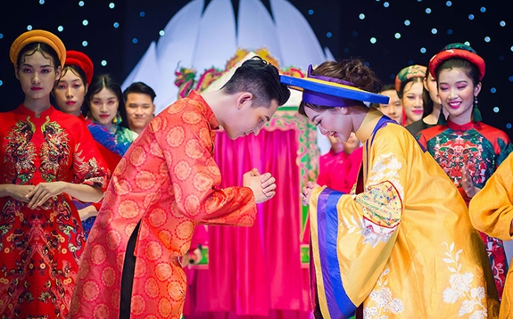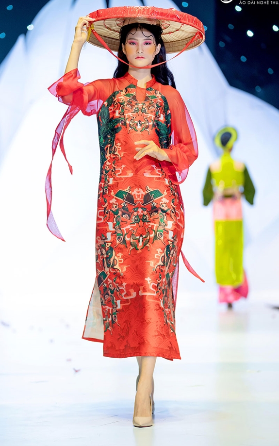 Tranh dân gian cũng là nguồn cảm hứng chủ đạo mà nhà thiết kế này luôn khai thác trong các mẫu áo dài của mình. Đặc biệt bộ sưu tập áo dài “Nhật Vượng Niên Hoa” gây ấn tượng với người xem là hình ảnh “đám cưới chuột”, “chuột múa rồng”.