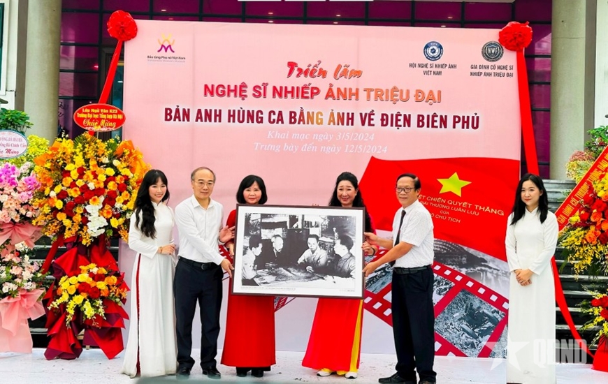 Gia đình nghệ sĩ nhiếp ảnh Triệu Đại trao những bức ảnh quý tặng Bảo tàng Phụ nữ Việt Nam. Ảnh: HOÀNG LÂN |