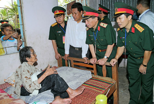 Thiếu tướng Phạm Văn Huấn, Tổng biên tập Báo QĐND, Trưởng ban tổ chức Cuộc đua đến thăm, tặng quà mẹ Thạch Thị Út, 98 tuổi, mẹ của liệt sĩ Hữu Chuông ở khóm 2, phường 1, thành phố Cà Mau.