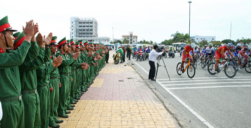 Các chiến sĩ, lực lượng vũ trang tỉnh Ninh Thuận cổ vũ hết mình cho đoàn đua xuất phát từ thành phố Phan Rang - Tháp Chàm (Ninh Thuận) đến thành phố Nha Trang (Khánh Hòa).