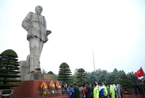 Ban tổ chức và đại diện các lực lượng tham gia giải đua xe đạp “Xuyên Việt - 2014, Cúp Quốc phòng Việt Nam” dâng hoa tưởng niệm Chủ tịch Hồ Chí Minh tại Quảng trường Hồ Chí Minh, thành phố Vinh (Nghệ An).