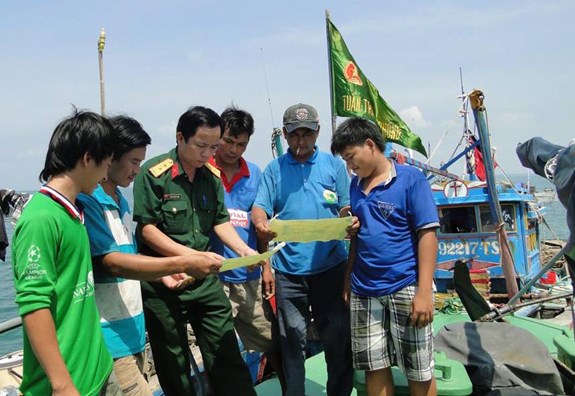 Nhà báo Phan Tùng Sơn hành trình cùng tàu biên phòng tham gia tuyên truyền pháp luật cho ngư dân trên biển Vũng Tàu-Côn Đảo, tháng 7-2015. Ảnh: KIM THANH. |