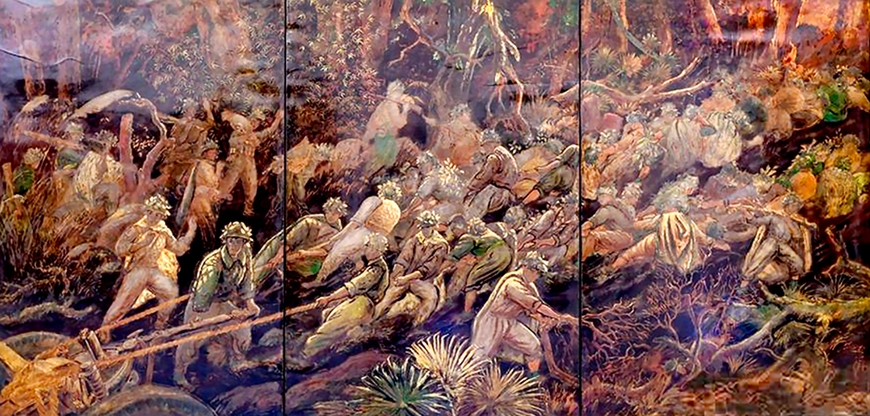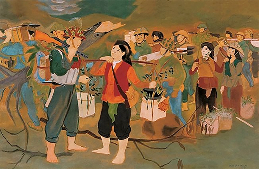 Tác phẩm “Kéo pháo ở Điện Biên Phủ” của họa sĩ Dương Hướng Minh. |