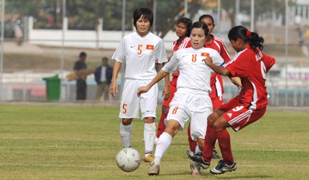 Phút thứ 10, cơ hội ghi bàn mở tỷ số đã đến với tuyển nữ VN nhưng trọng tài thổi phạt việt vị Kim Chi.