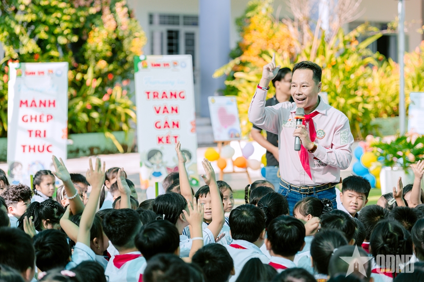 Đội viên, học sinh giao lưu với đại sứ văn hóa đọc. |