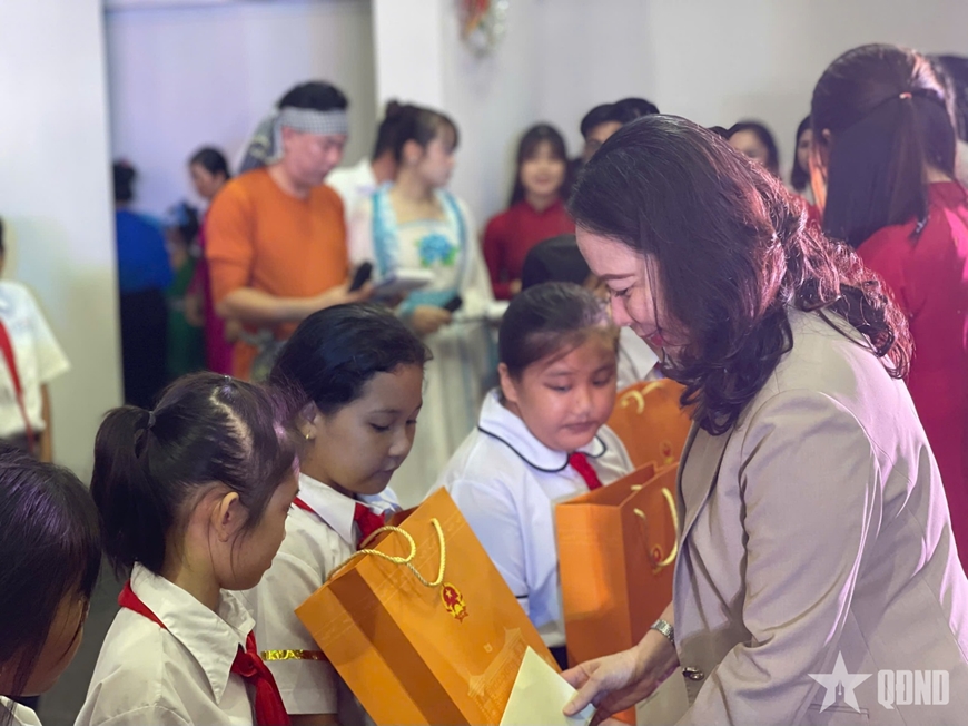 Phó chủ tịch nước Võ Thị Ánh Xuân trao quà trung thu và xe đạp tặng các em học sinh có hoàn cảnh khó khăn. |