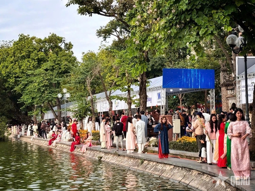 Một buổi chiều cuối tuần tháng 12, khi Tết Nguyên đán vẫn còn cách hơn một tháng, khu vực phố đi bộ hồ Hoàn Kiếm đã bắt đầu phảng phất không khí xuân. Trên các tuyến phố quanh hồ, những chiếc áo dài với nhiều màu sắc, kiểu dáng khác nhau và các phụ kiện truyền thống xuất hiện ngày một nhiều.
