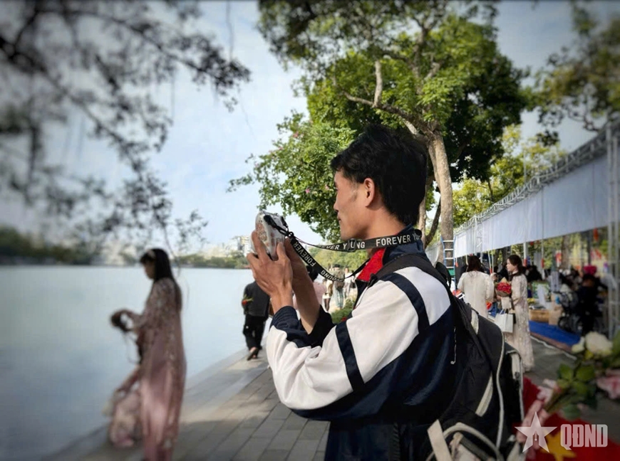 Những bậc thềm sát mặt nước, hàng cây rủ bóng xuống hồ, các gánh hoa ven đường hay khu vực trước tòa soạn Báo Hà Nội Mới trở thành điểm dừng chân quen thuộc của nhiều nhóm chụp ảnh. Mỗi góc nhỏ đều nhanh chóng chật kín người tạo dáng, chỉnh trang áo dài, thay phiên nhau ghi lại mọi khoảnh khắc giữa dòng người qua lại. Những địa điểm vốn quen thuộc nay được “làm mới” bằng sắc áo truyền thống và không khí rộn ràng của những buổi chụp ảnh Tết sớm.