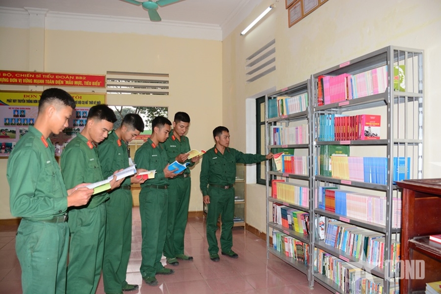 | Các chiến sĩ Tiểu đoàn 2, Trung đoàn 48, Sư đoàn 390 đọc sách vào ngày nghỉ tại phòng Hồ Chí Minh. |