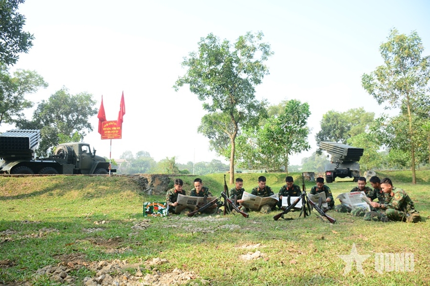 | Cán bộ, chiến sĩ Tiểu đoàn 3, Lữ đoàn 368 đọc báo giữa giờ giải lao trong ngày luyện tập. |