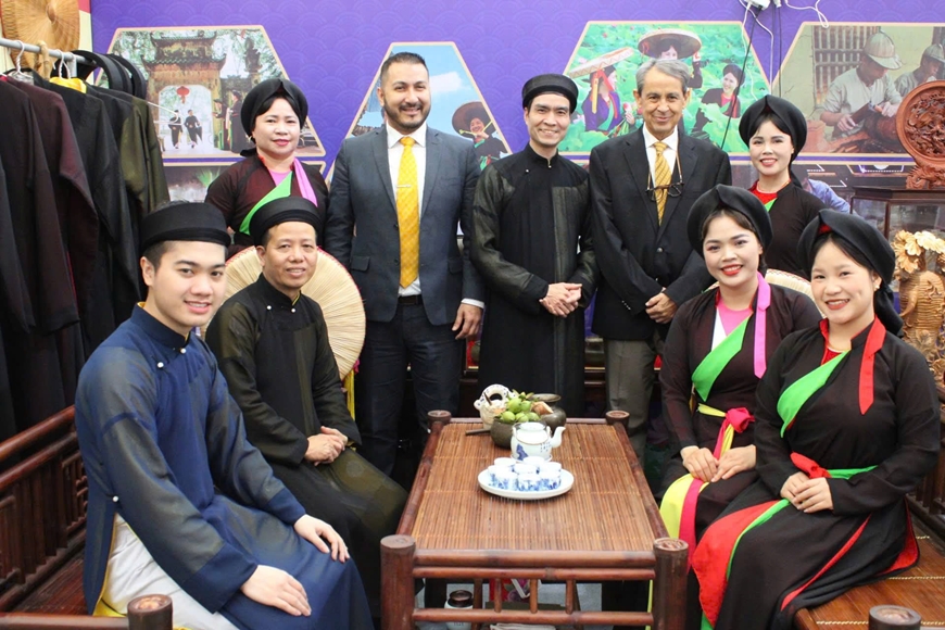 Không chỉ có vậy, ngày 12-3, đoàn chúng tôi còn vinh dự được đón tiếp Đại sứ Mexico tại Việt Nam Alejandro Negrin, tới tham quan không gian trưng bày “Quan họ xưa và nay”. Chúng tôi giới thiệu với ngài Đại sứ về ý nghĩa của miếng trầu têm cánh phượng, về trang phục truyền thống của liền anh, liền chị, về sự thủy chung, son sắt được gửi gắm trong từng câu hát. Sau khi lắng nghe, ngài Đại sứ bày tỏ sự cảm ơn và dành nhiều lời khen cho dân ca quan họ Bắc Ninh. Với chúng tôi, đó là niềm vui và cũng là minh chứng cho sức lan tỏa của quan họ tới bạn bè quốc tế.