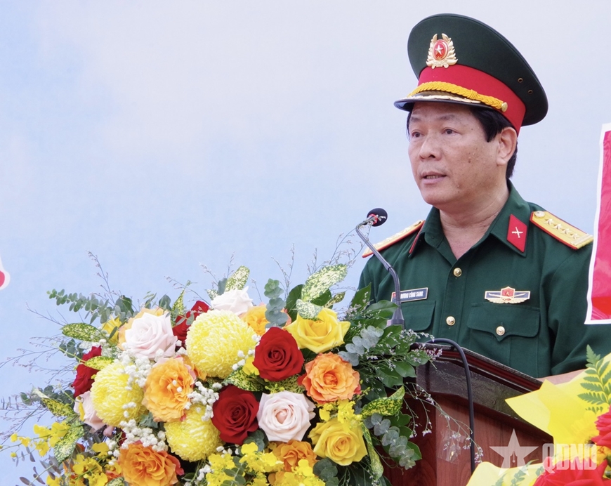 | Đại tá Dương Công Sang, Chủ nhiệm Chính trị Quân khu 9 phát biểu tại lễ khai mạc. |