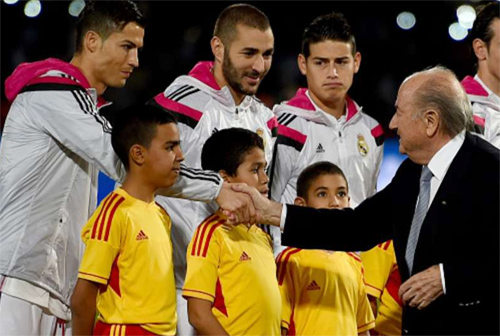 | Chủ tịch FIFA Sepp Blatter bắt tay Ronaldo và các cầu thủ hai đội trước khi khai mạc trận Chung kết |