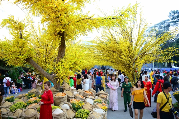 Phố hoa mai rực rỡ là điểm nhấn nổi bật của lễ hội Tết tại Nhà Văn hóa Thanh niên TP Hồ Chí Minh. |