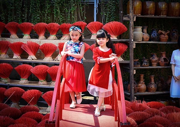 Khu vực làng nghề truyền thống làm hương được thiếu nhi thích thú chụp ảnh. |