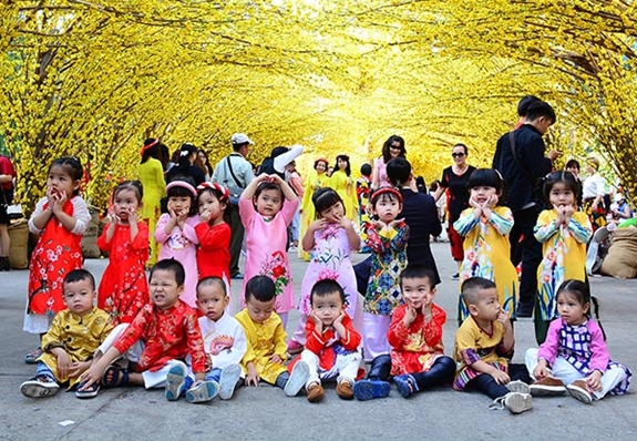 Các em thiếu nhi được gia đình đưa đi chụp ảnh Tết.