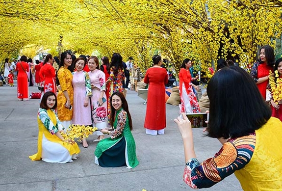 QĐND Online – Những ngày qua, hàng nghìn người dân và du khách đã đến tham quan, chụp ảnh, du xuân tại phố hoa mai, phố ông đồ tại Nhà Văn hóa Thanh Niên TP Hồ Chí Minh. Các bạn trẻ và nhiều gia đình trong trang phục áo dài truyền thống cùng nhau lưu lại những khoảnh khắc ý nghĩa trong những ngày Tết đến Xuân về. Phố hoa mai là hoạt động nổi bật của Lễ hội Tết Việt Canh Tý 2020 do Nhà Văn hóa Thanh niên Thành phố tổ chức.