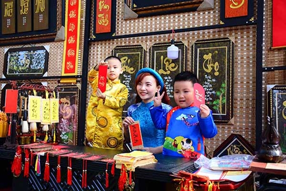 Tạo dáng chụp ảnh gia đình bên gian hàng ông đồ.