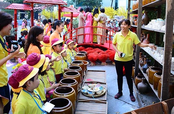 Các em thiếu nhi được giới thiệu về làng nghề gốm.
