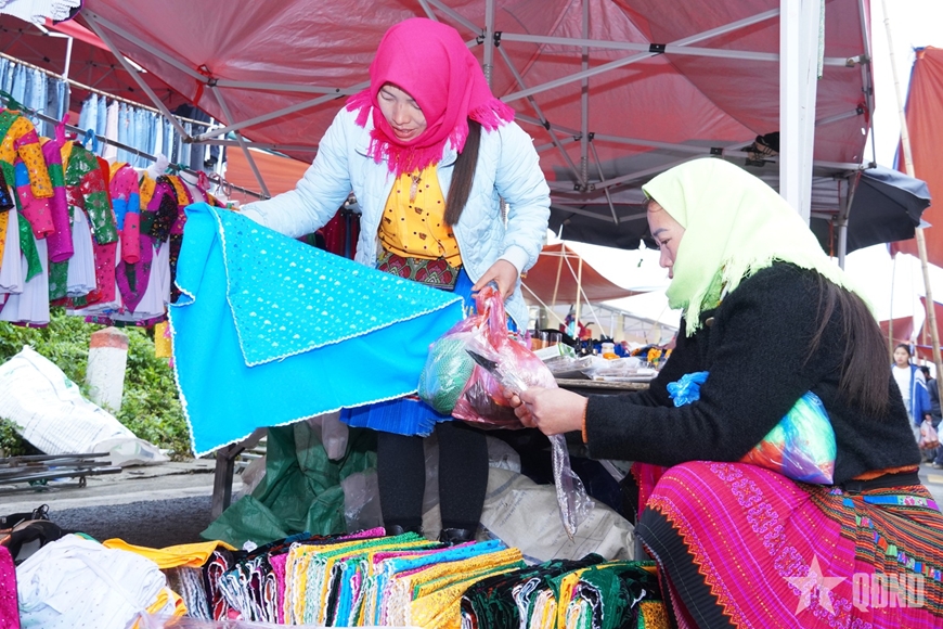 | Đồng bào lựa chọn vải vóc, khăn truyền thống tại chợ phiên. |