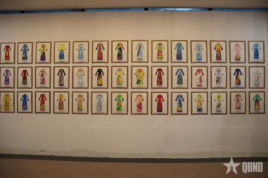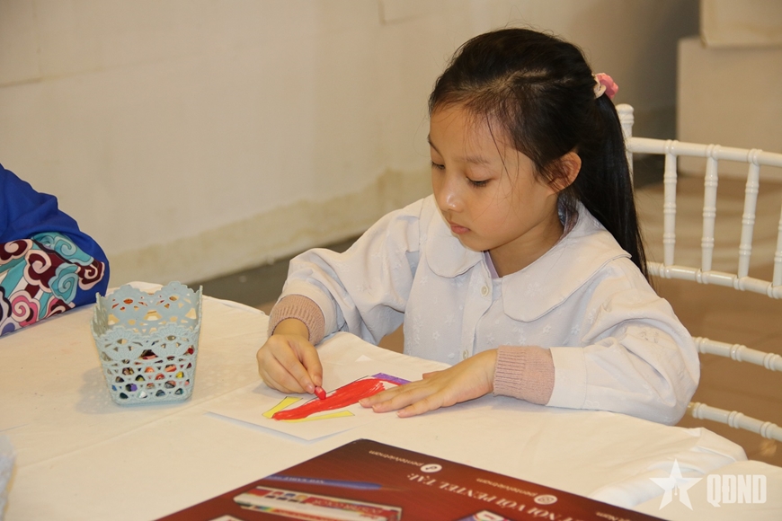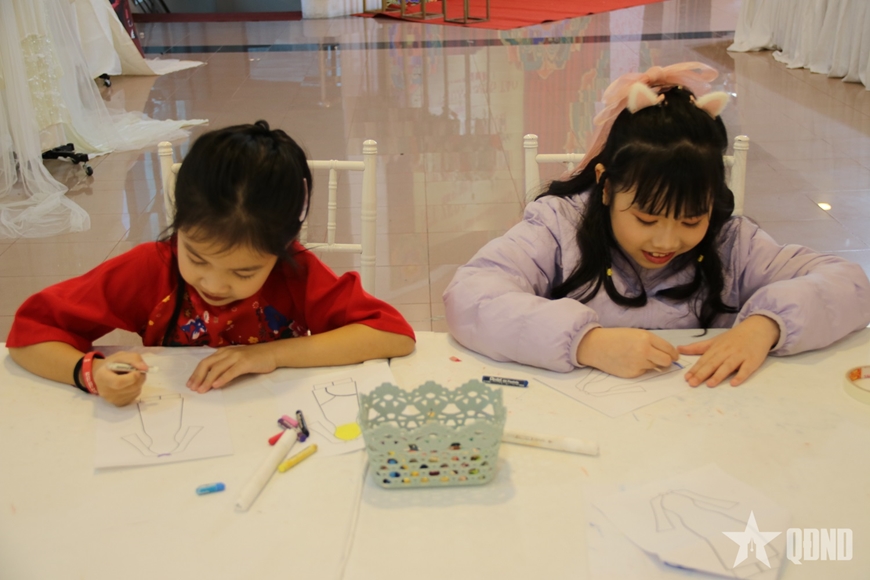 Ngay từ sáng sớm, khu trải nghiệm “Tết vẽ áo dài” dành cho thiếu nhi đã rộn ràng tiếng nói cười. Những chiếc bàn dài đặt sát nhau, trên đó là giấy vẽ, màu nước, sáp màu, bút dạ. Những gương mặt nhỏ nghiêng nhẹ theo từng đường nét, tập trung hoàn thiện bản thiết kế của mình. Trên nền tà áo dài trắng, các hình ảnh: Hoa đào, hoa mai, bánh chưng, bao lì xì, linh vật ngựa của năm Bính Ngọ,... lần lượt hiện lên bằng những gam màu tươi sáng. Có em phối màu cẩn thận, có em tô kín bức tranh bằng những họa tiết ngộ nghĩnh.