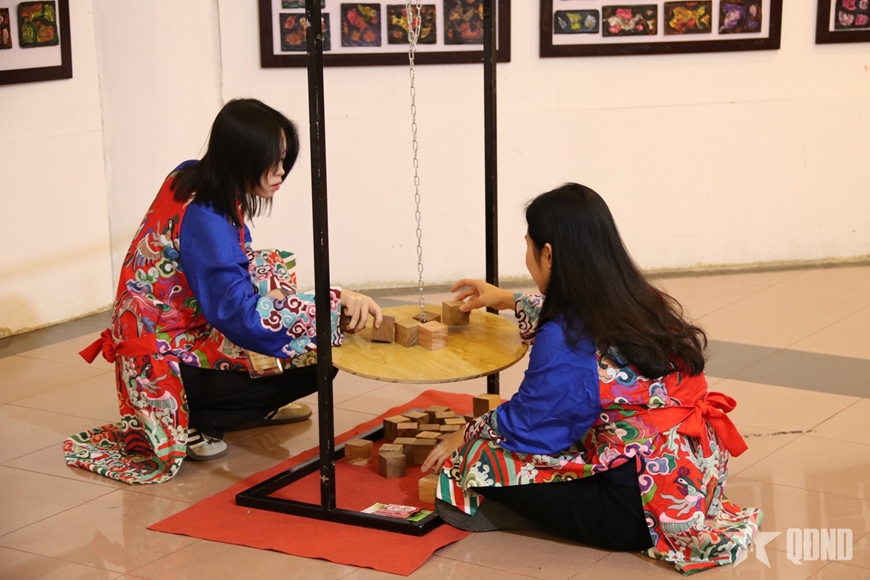 Nếu nghệ thuật giúp trẻ em kể lại mùa xuân, thì chuỗi hoạt động trải nghiệm lại mở ra cánh cửa để các em bước sâu hơn vào không gian Tết cổ truyền. Tại khu trò chơi dân gian, không khí trở nên rộn ràng hơn với tiếng cười nói xen lẫn tiếng hò reo cổ vũ. Các em nhỏ hào hứng thử sức với trò chơi ném còn, nhảy sạp, đi cà kheo… Mỗi trò chơi đều thu hút vòng tròn khán giả nhỏ tuổi đứng xem và chờ đến lượt. Có em còn chần chừ ở những bước đầu tiên, có em mạnh dạn thử sức nhiều lần cho đến khi thành thạo. Nhịp sạp gõ đều trên nền sân, những bước chân nhỏ thoăn thoắt rồi bật cười khi lỡ nhịp.