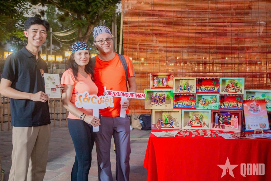 | Du khách nước ngoài tham quan khu vực trưng bày sản phẩm "Sắc Việt" tại Văn Miếu - Quốc Tử Giám. |