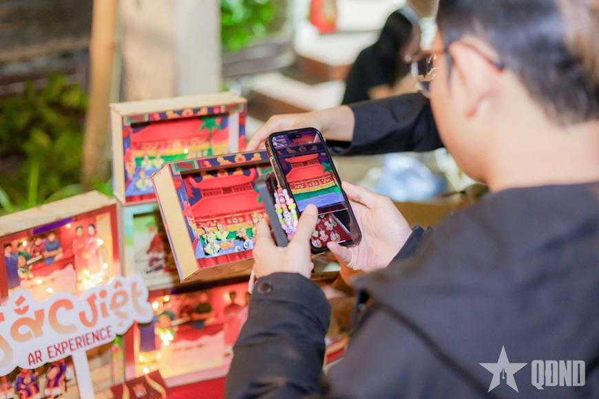 | Các bạn trẻ hứng thú trải nghiệm xem múa rối nước qua tranh gỗ 3D tích hợp công nghệ AR. |
