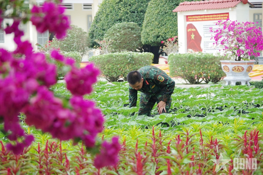 Đi dọc các trục đường nội bộ của Sư đoàn, chúng tôi chứng kiến những luống hoa, vườn hoa được quy hoạch thẳng hàng, bố trí khoa học. Nhiều đơn vị xây dựng vườn hoa, bồn hoa, chậu cảnh thành hình cờ Tổ quốc, khẩu hiệu hành động mừng Đảng - mừng Xuân. Các mô hình này thể hiện óc sáng tạo, bàn tay khéo léo của bộ đội.