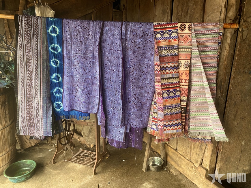 Dọc theo những lối nhỏ trong bản, những tấm vải lanh, những chiếc khăn, túi thổ cẩm được treo trước hiên. Màu chàm trầm, hoa văn nổi bật, tất cả mang theo dấu vết của bàn tay người làm.