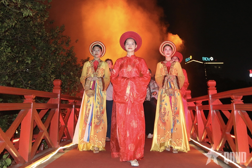 | Theo chân các "tiên nữ", khách tham quan tiếp tục hành trình tour đêm với “Nghi thức đón linh khí đất trời” tại cầu Thê Húc và Đắc Nguyệt Lâu. |