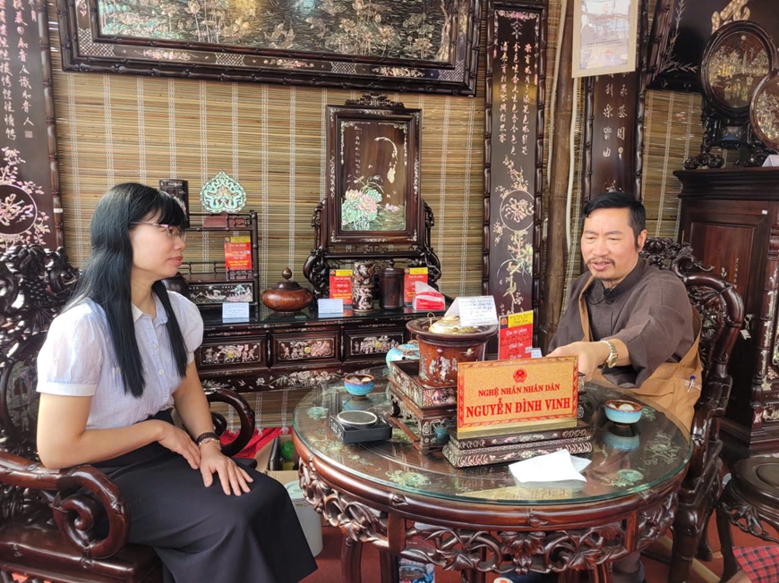 | Nghệ nhân Nhân dân Nguyễn Đình Vinh (tỉnh Bắc Ninh) giới thiệu với khách hàng về giá trị sản phẩm gỗ khảm trai truyền thống Việt Nam. |