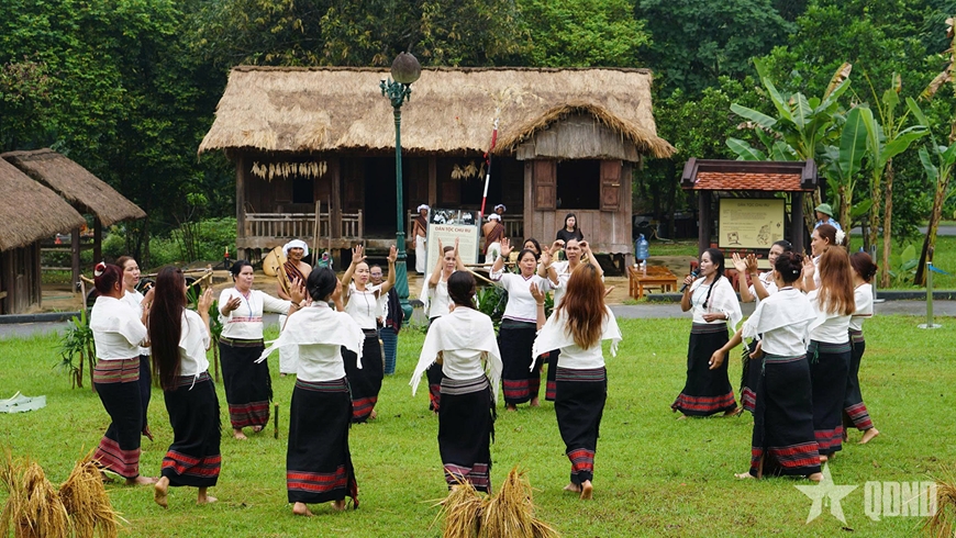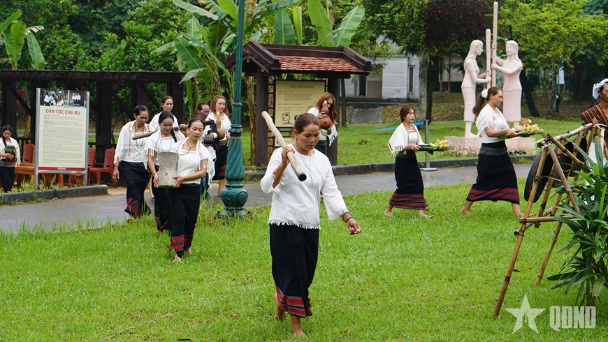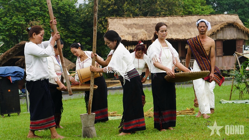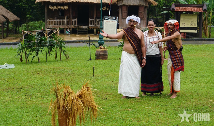 | Các công đoạn sản xuất nông nghiệp truyền thống quen thuộc của bà con Chu Ru được tái hiện, phản ánh nhịp sống lao động cần cù của người dân. |