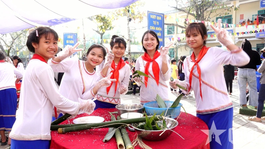 Điều đáng quý nhất của văn hóa Tết Ngã rạ hôm nay là sự lan tỏa mạnh mẽ ngay trong môi trường giáo dục. Vượt khỏi phạm vi thôn bản, di sản này đã bước vào sân trường, trở thành những bài học sống động cho thế hệ trẻ. Tại các điểm trường vùng cao Trà Bồng, Tết Ngã rạ được tổ chức như một không gian “thực hành văn hóa”. Các em học sinh được tự tay gói bánh, tự mình đánh chiêng và tự tin thuyết trình về ý nghĩa của từng món ăn, trang phục. Em Hồ Thị Kim Tuệ (học sinh Trường PTDT Nội trú THCS Trà Bồng) chia sẻ: "Được tham gia Lễ hội Tết Ngã rạ của nhà trường, em thấy rất tự hào. Em mong muốn Tết Ngã rạ sẽ tiếp tục được lưu truyền và lan tỏa".