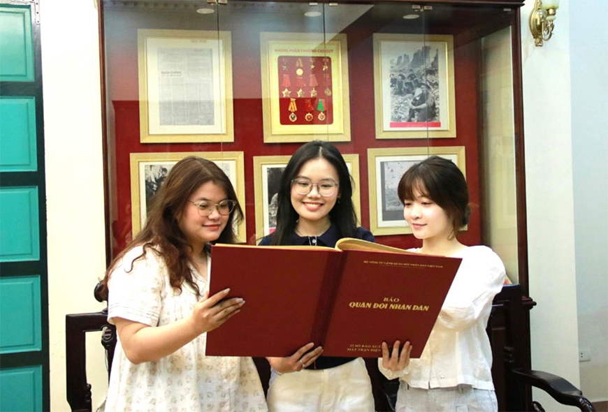 | Sinh viên Học viện Báo chí và Tuyên truyền tìm hiểu về 33 số Báo Quân đội nhân dân xuất bản tại Mặt trận Điện Biên Phủ. Ảnh: THÙY DUNG |