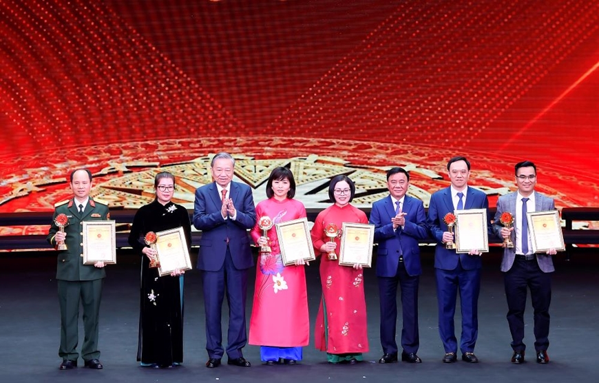 Tổng Bí thư Tô Lâm và đồng chí Trần Cẩm Tú, Ủy viên Bộ Chính trị, Thường trực Ban Bí thư, Chủ nhiệm Ủy ban Kiểm tra Trung ương trao giải A tặng các tác giả và đại diện nhóm tác giả. Ảnh: TUẤN HUY |