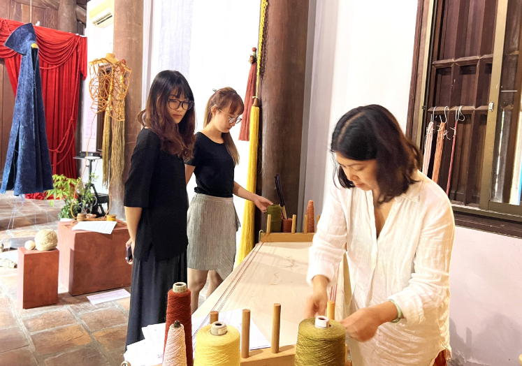 | Khách tham quan chứng kiến quá trình tách chỉ, bện dây tại triển lãm. |
