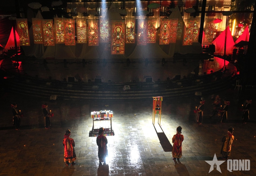 | Nghi lễ cấp sắc - phần thiêng trong đời sống của người Dao đỏ được thực hành trên sân khấu "Thiêng". |