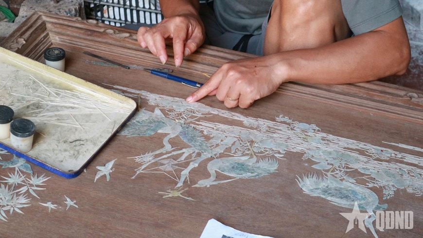 Để tạo nên một tác phẩm khảm trai hoàn thiện cần trải qua rất nhiều công đoạn. Ảnh: HUỆ CHI