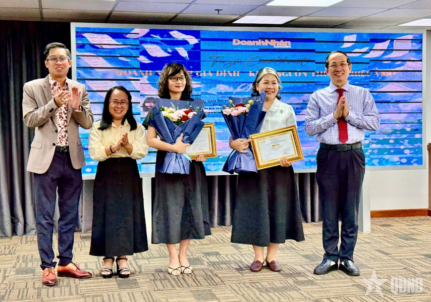 Đại diện lãnh đạo và Ban tổ chức trao giải Nhì cho các tác giả đoạt giải trong Cuộc thi viết “Doanh nghiệp gia đình - Nơi khơi nguồn thương hiệu Việt năm 2026”.