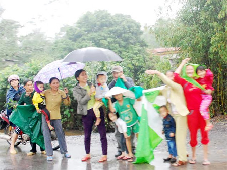 | Người dân huyện Lệ Thụy, tỉnh Quảng Bình đội mưa cổ vũ đoàn đua. |