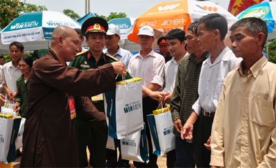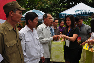 | Các nhà tài trợ, hảo tâm trao quà cho các đối tượng chính sách trong Cuộc đua "Về Trường Sơn 2012-Cúp Báo Quân đội nhân dân". Ảnh: Phú Sơn |