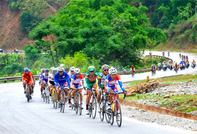 | Các cua-rơ thi tài trong Cuộc đua xe đạp "Về Điện Biên Phủ-2014, Cúp Báo Quân đội nhân dân". Ảnh: Trọng Hải |