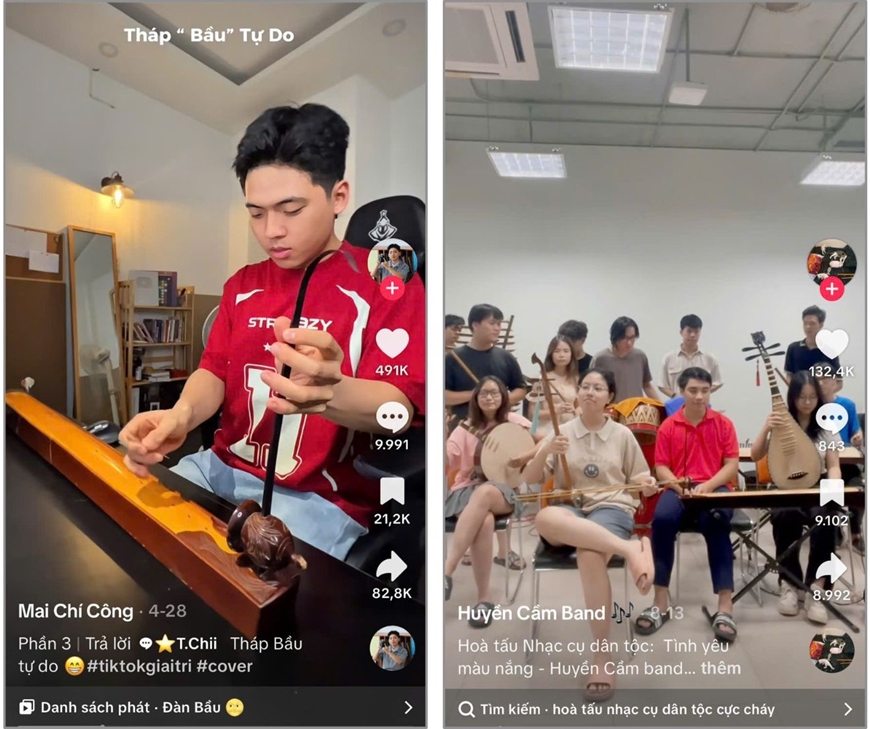 Trên Tiktok của nghệ sĩ trẻ Mai Chí Công, các video đàn bầu bản nhạc nổi tiếng như: “Die with a smile”, “Phép màu”.... được anh biến tấu một cách mới lạ, trở nên thu hút đến lạ thường. Ở dưới các bài đăng của anh, nhiều bạn trẻ tỏ ra hào hứng và bày tỏ mong muốn anh tiếp tục thực hiện các tác phẩm với đàn bầu. Hay như bản hòa tấu “Tình yêu màu nắng” bằng các nhạc cụ dân tộc của nhóm Huyền Cẩm Band thời gian qua đã tạo được hiệu ứng lan tỏa mạnh mẽ, khiến nhiều người trẻ tò mò và muốn thử chơi những nhạc cụ truyền thống.