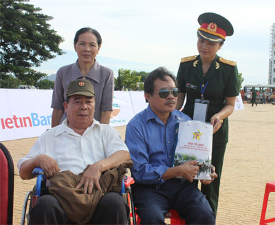 | Cán bộ hoạt động tình nghĩa của Ban tổ chức Cuộc đua chăm sóc các thương binh nặng đến nhận quà tình nghĩa. |